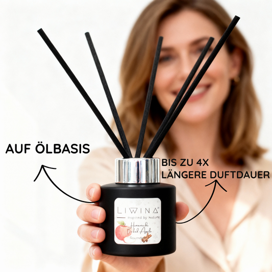 Unsere Raumdüfte werden in Deutschland in Handarbeit hergestellt – mit hochwertigen, ölbasierten Rezepturen. Dadurch sind sie intensiver, natürlicher und halten bis zu viermal länger als herkömmliche Diffusoren.
